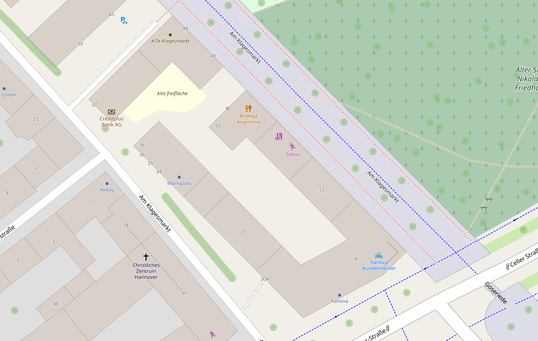 KlagesmarktPlatz am Rande der lebendigen Innenstadt und der bunten Nordstadt Hannovers. Da, wo im Mittelalter vor den Toren der Stadt Hannover ein Schützen- und Marktplatz war. Neben dem Alten St.-Nikolai-Friedhof und der Nikolaikapelle, dem vermutlich ältesten erhaltenden Bauwerk Hannovers, benannt nach dem heiligen Nikolaus, dem „ Sünte Klages“, der auch unserem Marktplatz seinen Namen gegeben hat. Wo über viele Jahrhunderte die Schützenfeste stattfanden, wo Blumen-, Vieh- und Jahrmärkte abgehalten worden sind. Wo ab Mitte des 19. Jahrhunderts die rasch wachsende Stadt Hannover sich ausdehnte und Gründerzeitgebäude den Platz baulich einfassten. Und wo im Faschismus Zwangsarbeiter einen Luftschutzbunker bauen mussten, der dann im Sommer 2013 zur Vorbereitung der Bebauung mit großem Aufwand beseitigt wurde. Auf dem südlichen Teil dieser Fläche stehen 8 Gebäude, zwei davon werden seit Frühjahr 2017 von uns bewohnt. Wo, bitte, ist der Klagesmarkt?